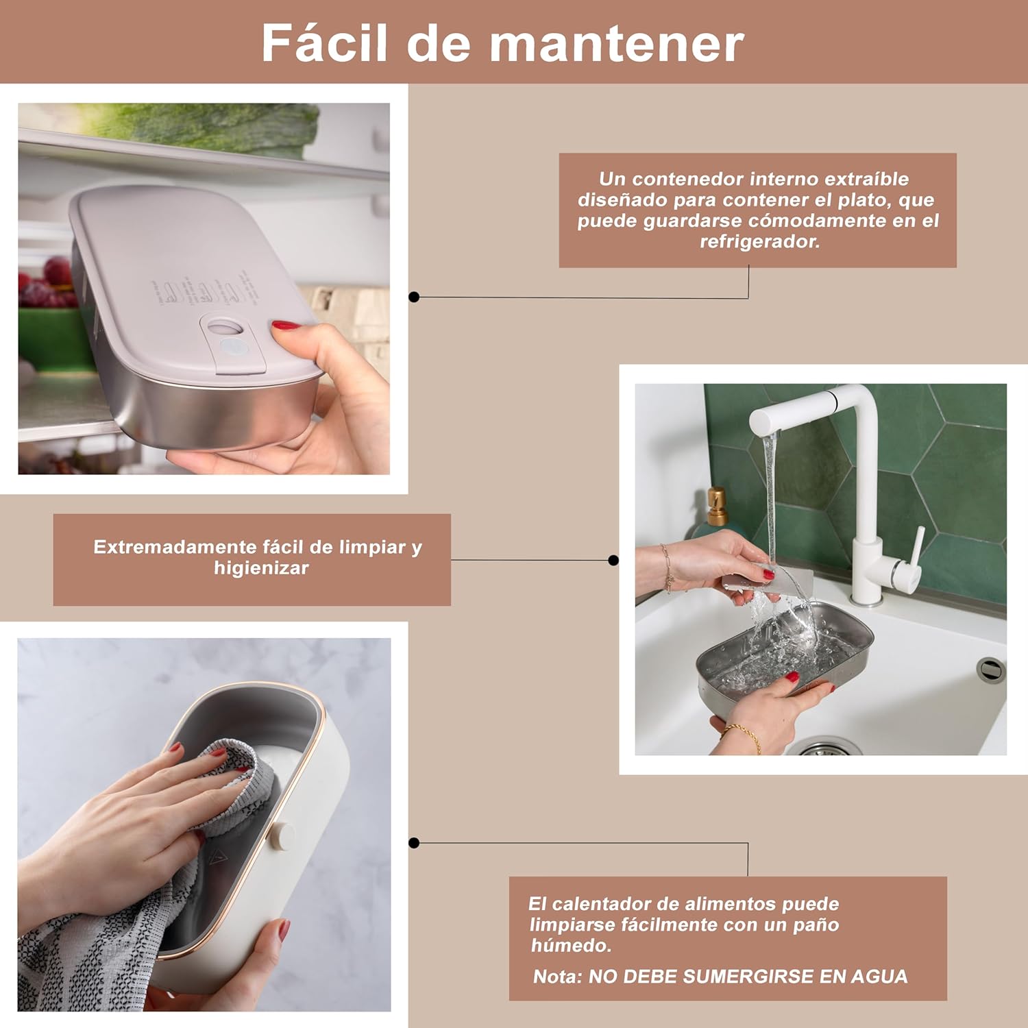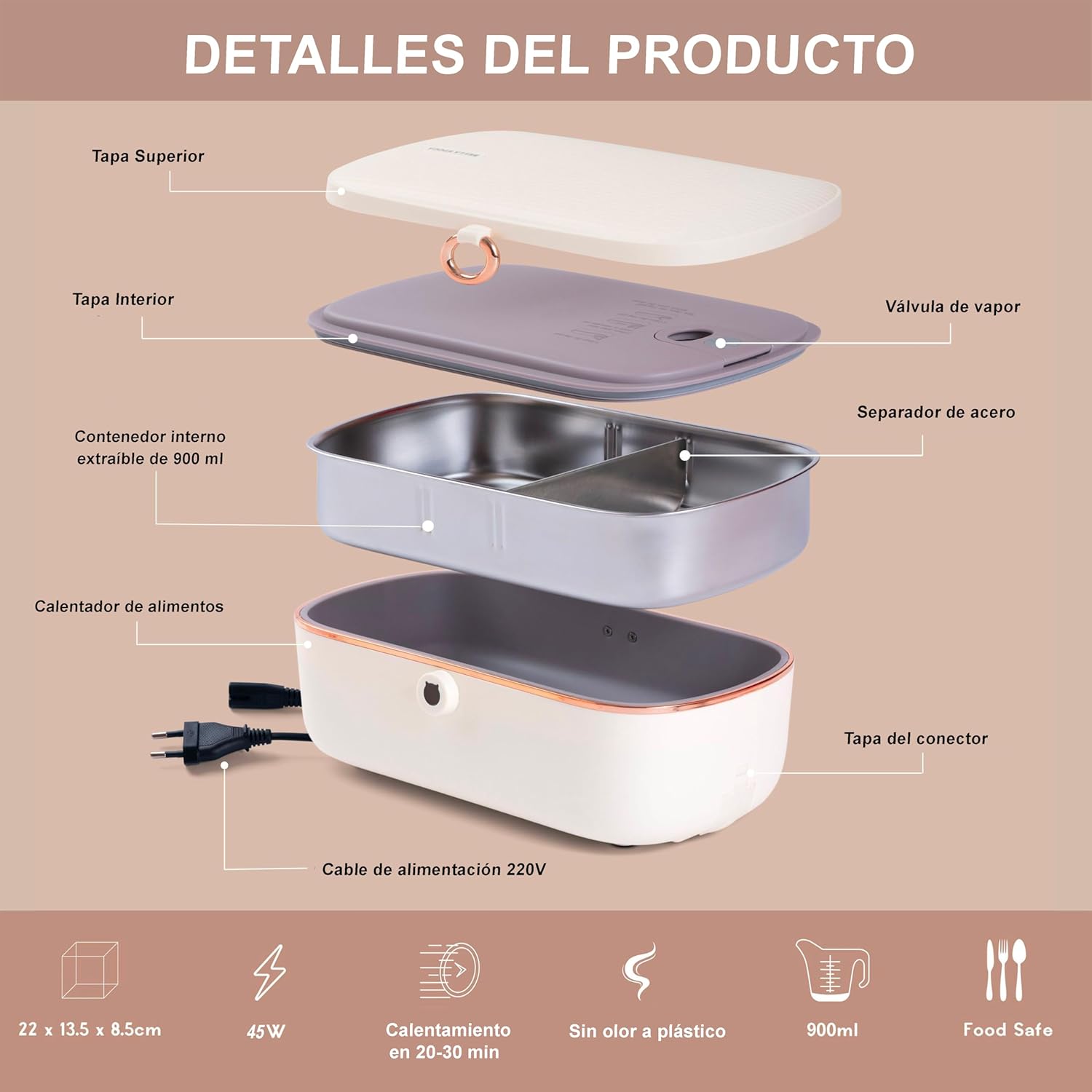 La bandeja interna de acero inoxidable es removible y está equipada con una tapa hermética y una banda elástica de seguridad, lo que te permite dejar el calentador de comida en la oficina y llevarte solo el contenedor interno a casa.